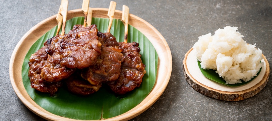 Les brochettes sont cuites sur une sorte de barbecue thaïlandais et sont badigeonnées de glaçage pour garder un aspect luisant et apporter du moelleux à la viande. Elles sont accompagnées de riz gluant, qui est une variété de riz provenant d’Asie du Sud-Est. Une fois cuit, il possède une texture à la fois collante et moelleuse.