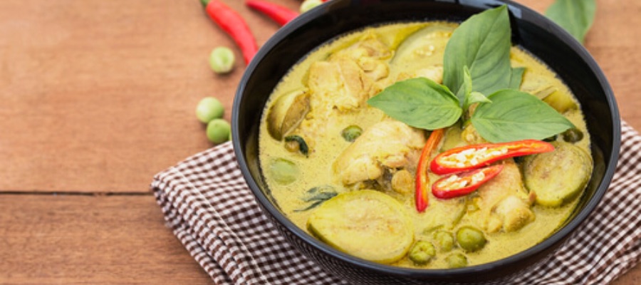 Aussi appelé Keng Kiew Wan en thaï, c’est l’un des currys les plus typiques de Thaïlande mais aussi l’un des plus piquants. Il a une saveur très herbacée puisqu’on y trouve des parfums de coriandre, citron vert, feuille de lime kaffir et citronnelle. Le piment vert présent dans la pâte de curry est très puissant et chauffera les papilles des plus gourmands.
