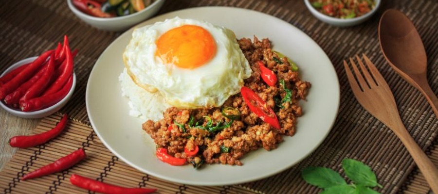 C’est certainement l’un des plats les plus populaires de Thaïlande. Il est très apprécié par les touristes et par les thaïs. Ce plat est tout simple : de la viande hachée, généralement du poulet ou du porc, revenu avec de la sauce soja, des piments rouges et du basilic thaï. Il est servi avec du riz et un œuf frit, qui est un oeuf au plat revenu dans l’huile.