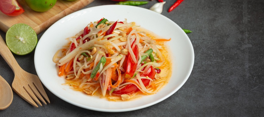 Originaire du nord du pays, la célèbre salade de papaye verte est absolument à tester en Thaïlande. Attention cependant aux plus sensibles, elle est souvent très très épicée. On la prépare à base de papaye râpée, de piment et de citron, ce qui en fait un mélange explosif ! Du sucre est aussi ajouté pour adoucir le tout.
